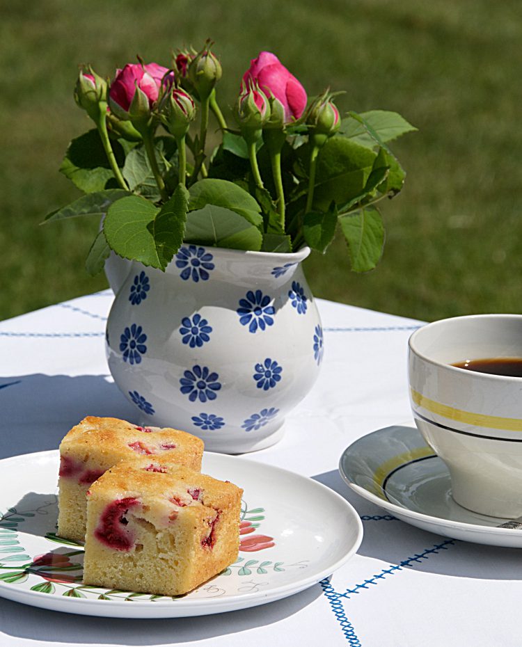 Häll i formen och strö hallonen över – jag brukar trycka ner dem lite i smeten.